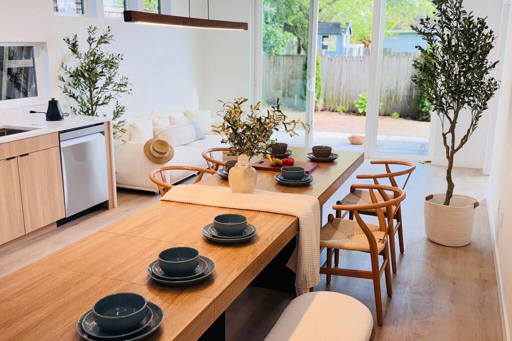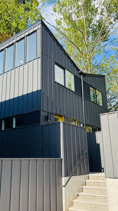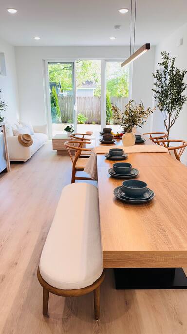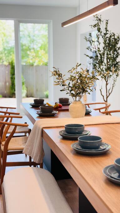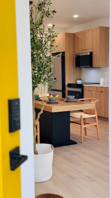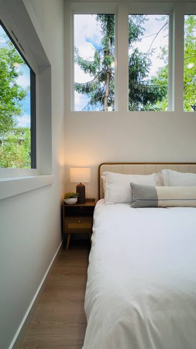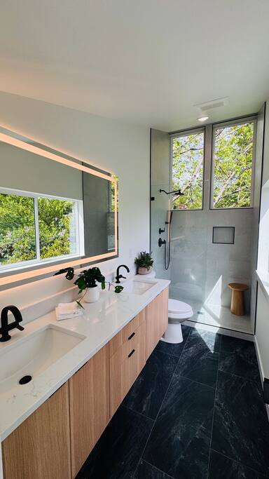 π Modern Luxury & Comfort: Step into your newly built designer retreat, featuring up to 15-ft ceilings, skylights, and oversized windows that fill the home with natural light. Every corner of this 4-bedroom, 2-bath home is crafted for elegance and function β perfect for families, business travelers, or long-term guests. β‘οΈ Modern Amenities: High-end finishes and contemporary design Samsung Bespoke appliances for a premium kitchen experience Central A/C and heating for year-round comfort Regular outdoor outlet by the front door to charge your EV (bring your own adapter and charging cable) In-unit washer and dryer for convenience π³ Gourmet Kitchen: Fully equipped kitchen with cookware, dishware, and utensils Sleek Samsung Bespoke refrigerator, oven, and microwave Coffee maker, toaster, and dining area for six π Sleeping Arrangements: Primary Bedroom: King bed with ensuite bath Bedrooms 2β3: Each with plush queen beds and storage Bedroom 4: Full bed. No curtain available Premium bedding and blackout curtains for restful sleep π³ Private Outdoor Space: Enjoy a private yard β ideal for morning coffee, reading, or entertaining guests Patio seating area and green space for relaxation π Convenient Parking: 1 assigned parking space in front of the house Tight driveway shared with the neighboring home β please park carefully Garage available but compact β best suited for small vehicles Free street parking also available nearby π§Ί Laundry: In-unit washer & dryer