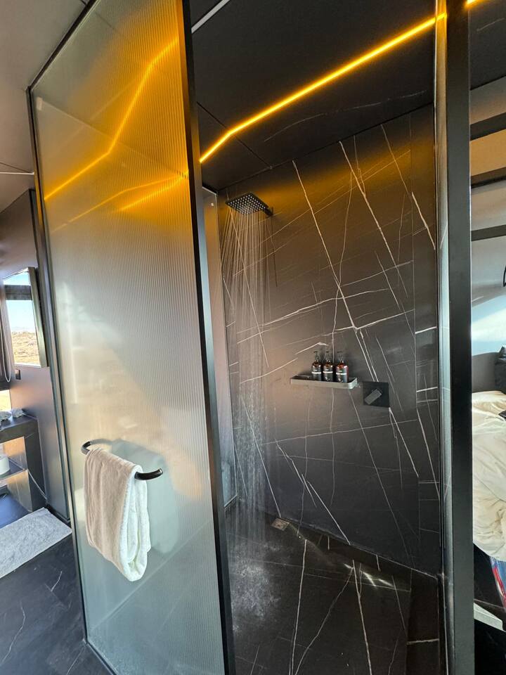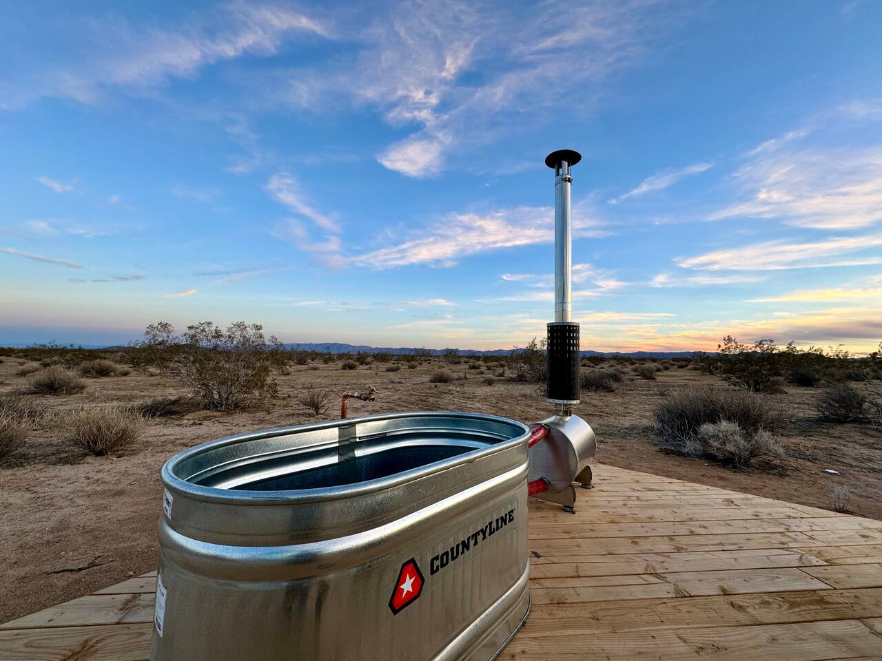 Welcome to our Romantic Offgrid Glamping Experience in Joshua Tree! ☆ Positioned strategically to capture the beauty of the sunrise, this shipping container offers a one-of-a-kind perspective on the desert landscape. ☆ ➤ Outdoor Fireplace Seating: Enjoy the warmth of our outdoor fireplace with seating for two, ideal for stargazing and relaxation under the night sky. ➤ Unique Hot Tub Experience: Indulge in a not-so-typical hot tub experience, providing a relaxing soak with a twist. ➤ Queen Size Bed: Sleep in comfort on our queen size bed, with the option to stargaze through the open curtains and sky light. ➤ Kitchenette: Prepare meals with ease using our kitchenette, complete with a portable stove, dishes, and cooking essentials. ➤ Inside has a Toilet, Bath, and Kitchenette for you to use within your stay. Experience a one-of-a-kind getaway by spending the night in the midst of Joshua Tree's natural beauty. Book now for an unforgettable stay unlike any other!