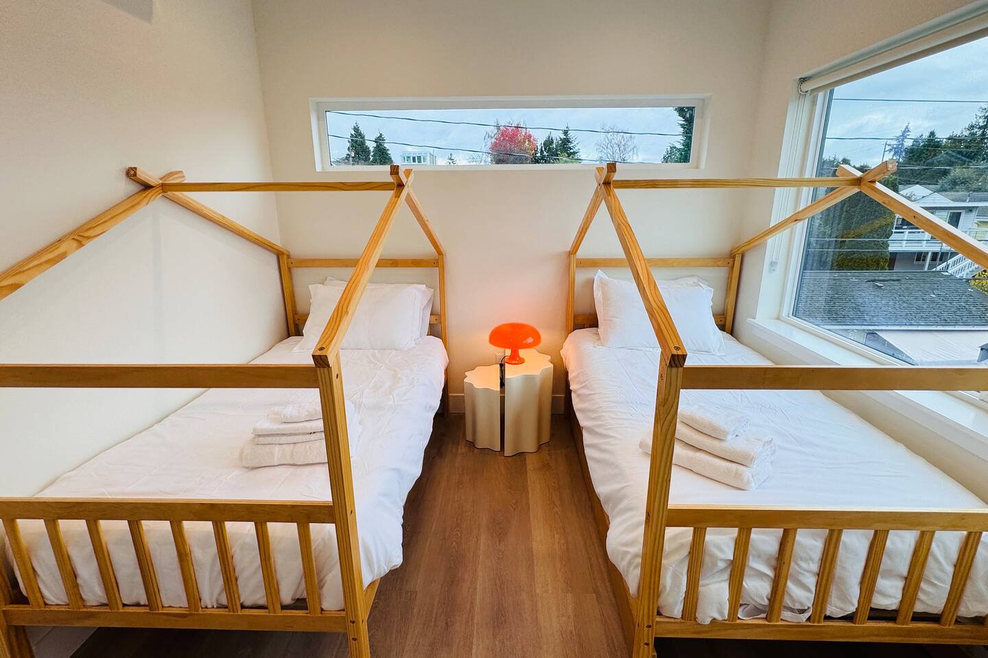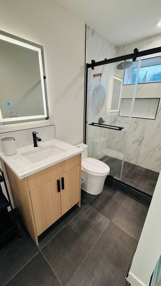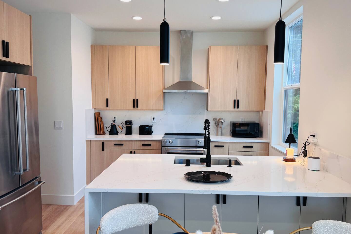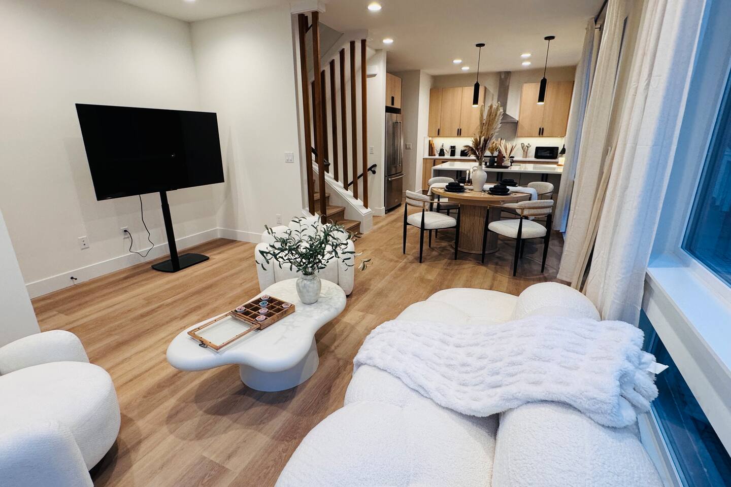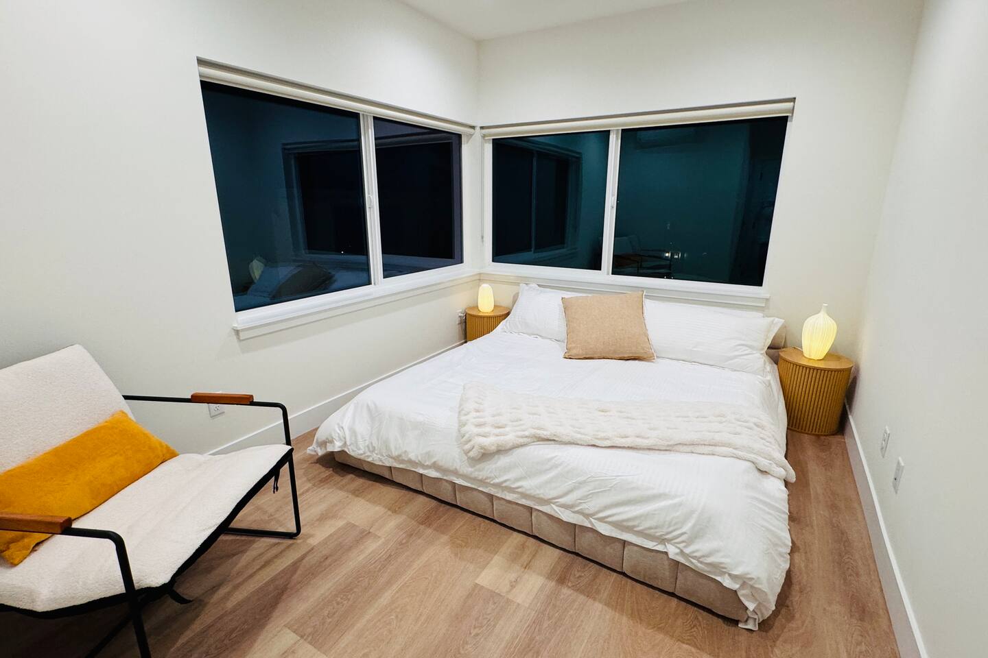 🌟 Newly Built 3-Story Modern Home: Contemporary design with bright, open living areas High-end finishes and large windows throughout Private off-street parking behind the home 🛌 Bedrooms: Bedroom 1 (Master Suite): King bed • Ensuite bathroom • Floor heating • Ductless A/C Bedroom 2: Two twin beds • Ductless A/C Bedroom 3: Full bed • Ensuite bathroom • Ductless A/C 🛁 Bathrooms: 3.5 bathrooms total Heater in every bathroom Floor heating in the master ensuite 📺 Entertainment: 65" Smart TV in living room YouTube streaming available (no login required) High-speed Wi-Fi 🍳 Kitchen & Dining: Fully equipped modern kitchen Stainless steel appliances Spacious dining area for group meals 🔥 Climate Comfort: Ductless split A/C in each bedroom Bathroom heaters Efficient heating system
